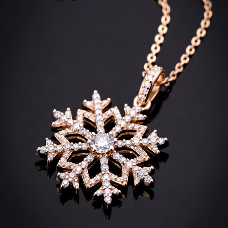 Металл: розовое золото 750 пробы — тёплое, нежное, делает снежинку удивительно уютной и женственной. Ушко и обратная сторона тоже украшены мелкими бриллиантами, чтобы она сверкала со всех сторон.